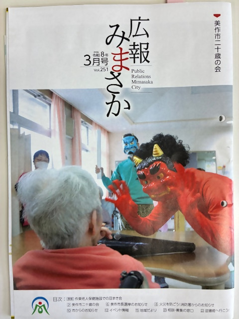 2月3日(火)節分の日に、入所者の皆さん、通所リハビリテーションのご利用者さまと「豆まき」をおこないました。職員が扮した赤鬼・青鬼に、新聞紙を丸めて作った豆を投げ、1年間の息災を祈りました。また、この様子は3月号の「広報みまさか」の表紙でも紹介されました。